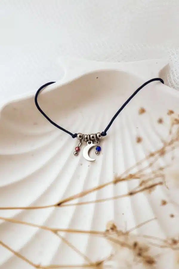 Bransoletka została wykonana z granatowej nici jubilerskiej, która pięknie kontrastuje z odcieniami różu i niebieskiego, tworząc harmonijną i elegancką całość. Zawieszka w kształcie księżyca, wykonana ze stali szlachetnej, symbolizuje ochronę i duchowe prowadzenie, dodając całości subtelnego uroku.