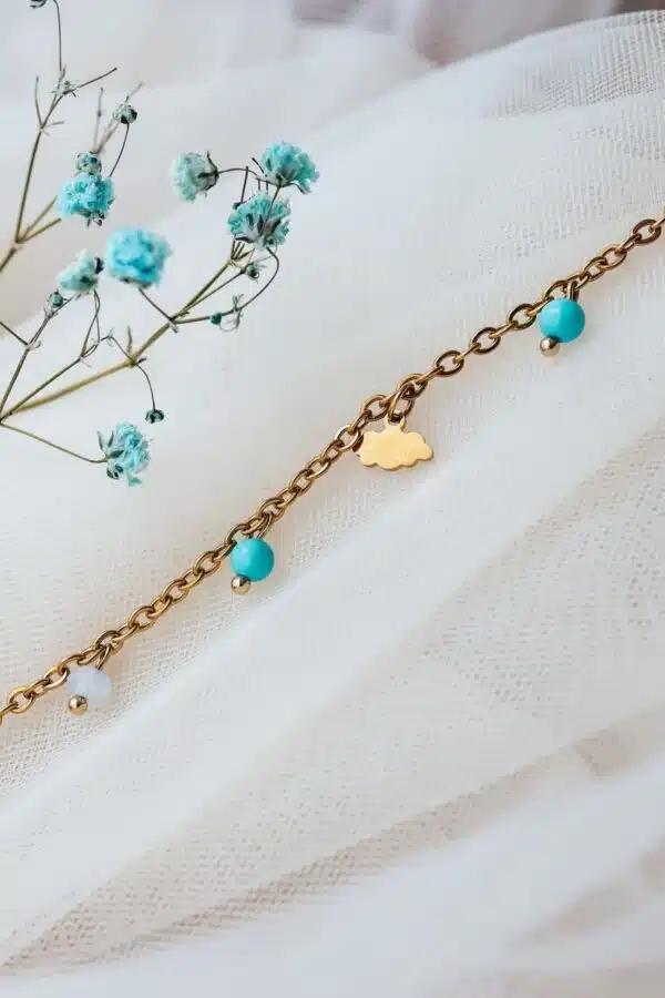 Talizman wykonany jest na łańcuszku ze stali szlachetnej w kolorze złotym, a kamienie w odcieniach błękitu dodają mu elegancji i subtelności. Złota zawieszka w kształcie chmurki symbolizuje lekkość i delikatność, doskonale uzupełniając energetyczny charakter bransoletki.