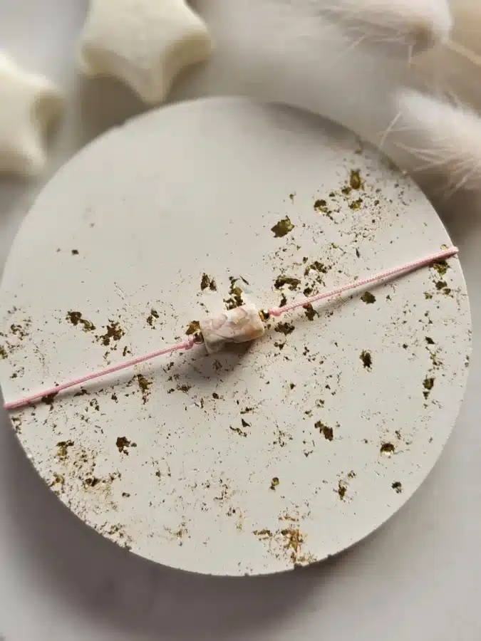 Bransoletka została wykonana z jasnoróżowej nici jubilerskiej, która doskonale komponuje się z beżowymi odcieniami Opalu, tworząc elegancki, a zarazem subtelny dodatek. Uniwersalny rozmiar bransoletki sprawia, że jest ona wygodna w noszeniu i idealnie dopasowuje się do każdego nadgarstka.