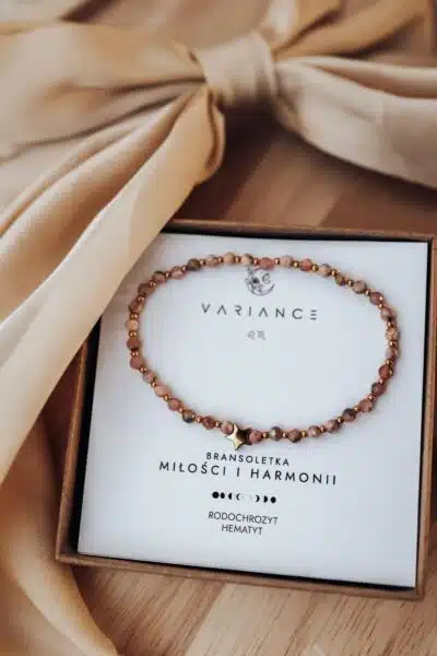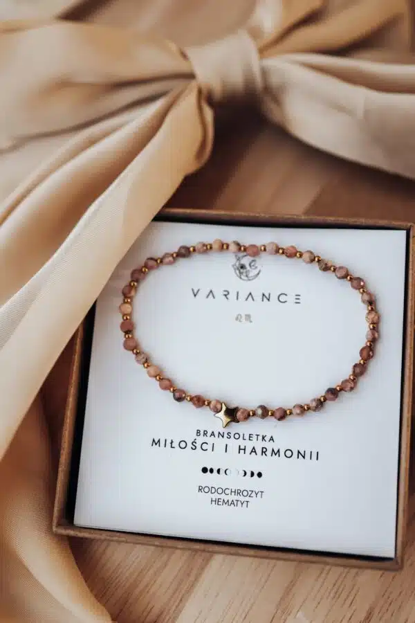Bransoletka Miłości i Harmonii wykonana z naturalnego Rodochrozytu, ozdobiona złotą zawieszką w kształcie gwiazdki z Hematytu. Idealna dla osób poszukujących miłości i równowagi.