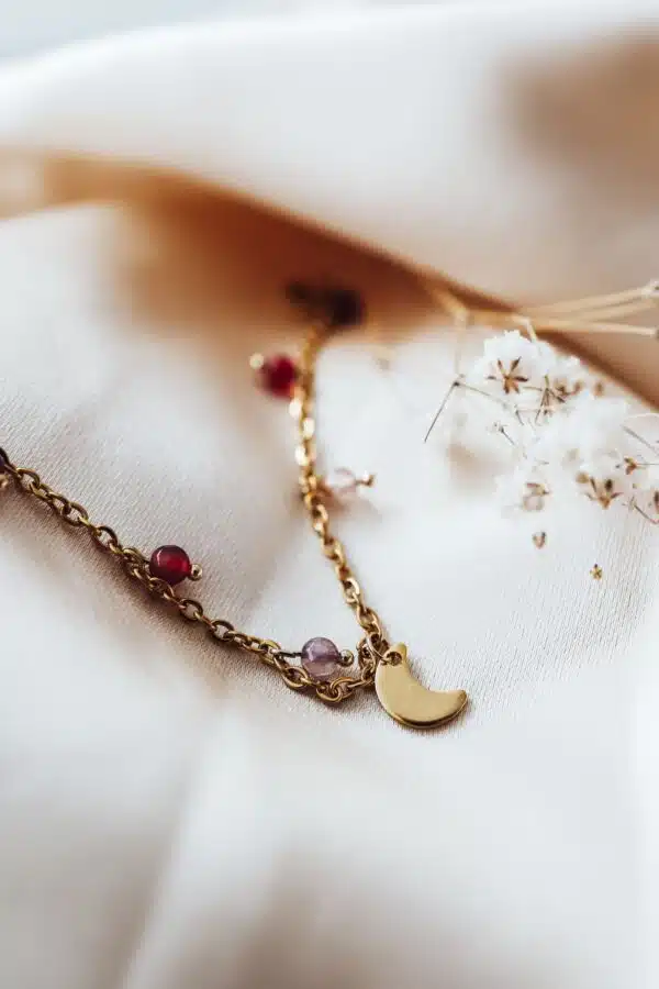 Delikatne odcienie czerwieni i różu Agatu Turmalinowego pięknie komponują się ze złotym łańcuszkiem ze stali szlachetnej, tworząc subtelny, a zarazem wyrafinowany dodatek. Zawieszka w kształcie księżyca w kolorze złotym symbolizuje cykl odrodzenia i ochrony, dodając bransoletce unikalnego charakteru.