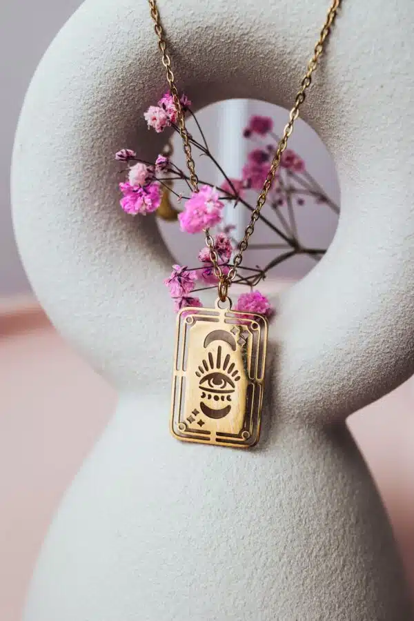 Amulet Mądrość Tarota to złoty łańcuszek ze stali szlachetnej, ozdobiony zawieszką w kształcie karty tarota z wyciętym okiem, promieniami słonecznymi i dodatkowymi symbolami. Na zapięciu znajduje się dodatkowa zawieszka w kształcie księżyca, co dodaje naszyjnikowi dodatkowej warstwy ochronnej i duchowej głębi.