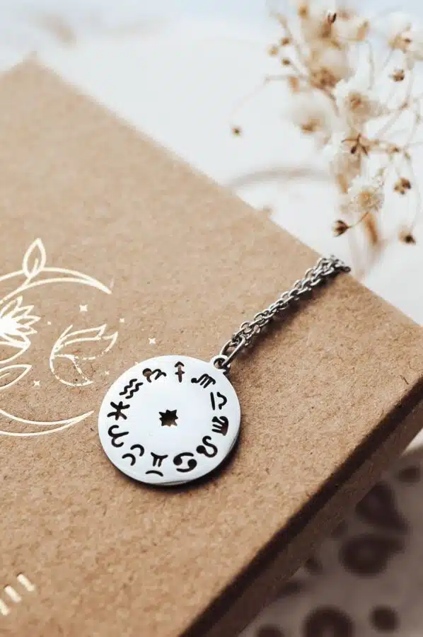 Centralnym elementem naszyjnika jest okrągła zawieszka, na której wycięto symbole dwunastu znaków zodiaku, ułożonych w harmonijnym kręgu. Każdy z tych symboli reprezentuje unikalne cechy i energie związane z danym znakiem, od odwagi Barana, przez intuicję Raka, po równowagę Wagi. Noszenie tego naszyjnika pozwala na czerpanie korzyści z energii wszystkich znaków, co wspiera równowagę emocjonalną, ochronę duchową i wewnętrzny rozwój.