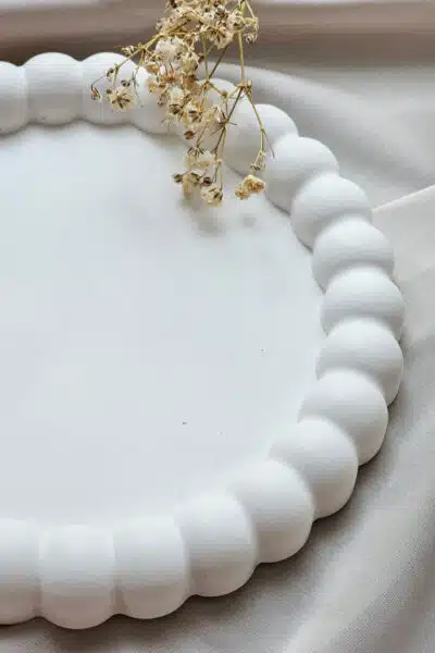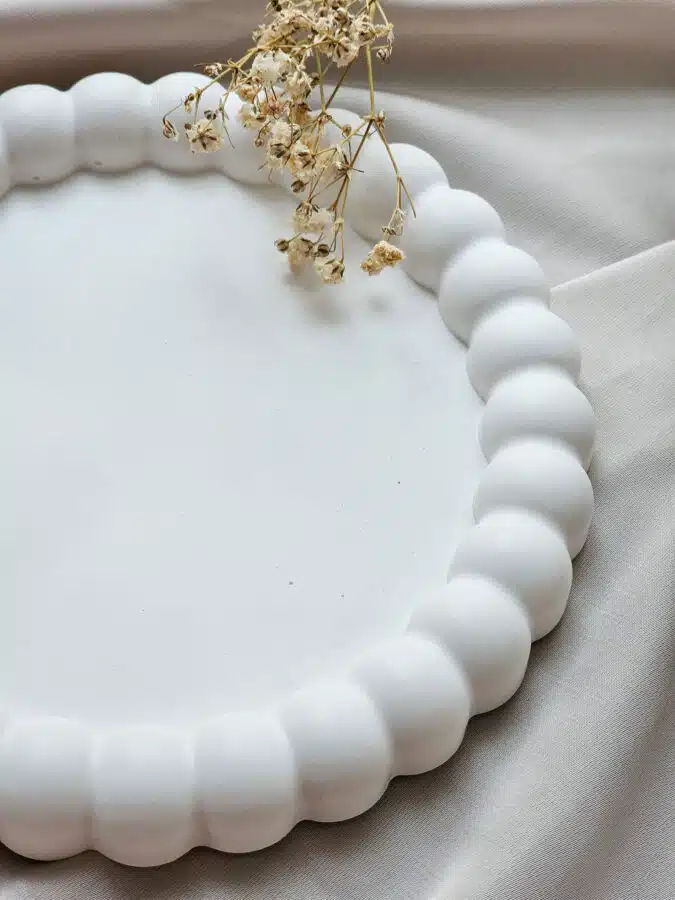 Podstawka Fala Spokoju to ręcznie wykonana, biała podstawka z delikatnym falistym wzorem na krawędzi. Symbolizuje harmonię, spokój i elegancję. Idealna do przechowywania świec, biżuterii lub innych drobiazgów. Każdy egzemplarz jest unikalny.