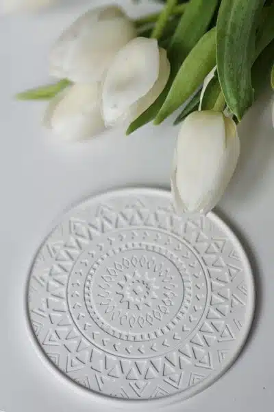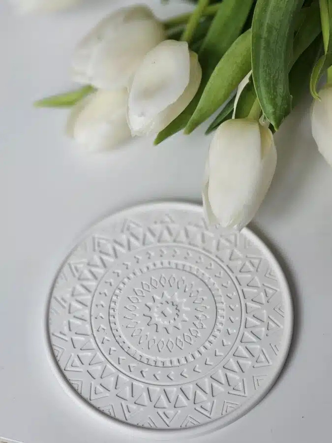 Podstawka Mandala Krąg Życia to ręcznie wykonana, biała podstawka z misternymi wzorami inspirowanymi cyklicznością życia i równowagą. Symbolizuje harmonię, wewnętrzny spokój i duchowy rozwój. Idealna do przechowywania biżuterii, świec lub innych drobiazgów. Każdy egzemplarz jest unikalny.