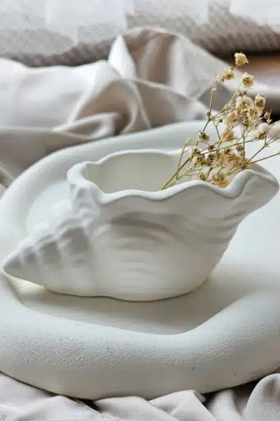 Podstawka Muszla Energii Oceanu to ręcznie wykonana, biała podstawka w kształcie muszli, która emanuje energią oceanu. Idealna do przechowywania biżuterii, świec lub innych drobiazgów, wnosząc do wnętrza powiew morskiej świeżości i harmonii. Każdy egzemplarz jest unikalny.