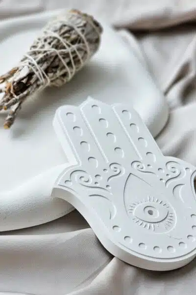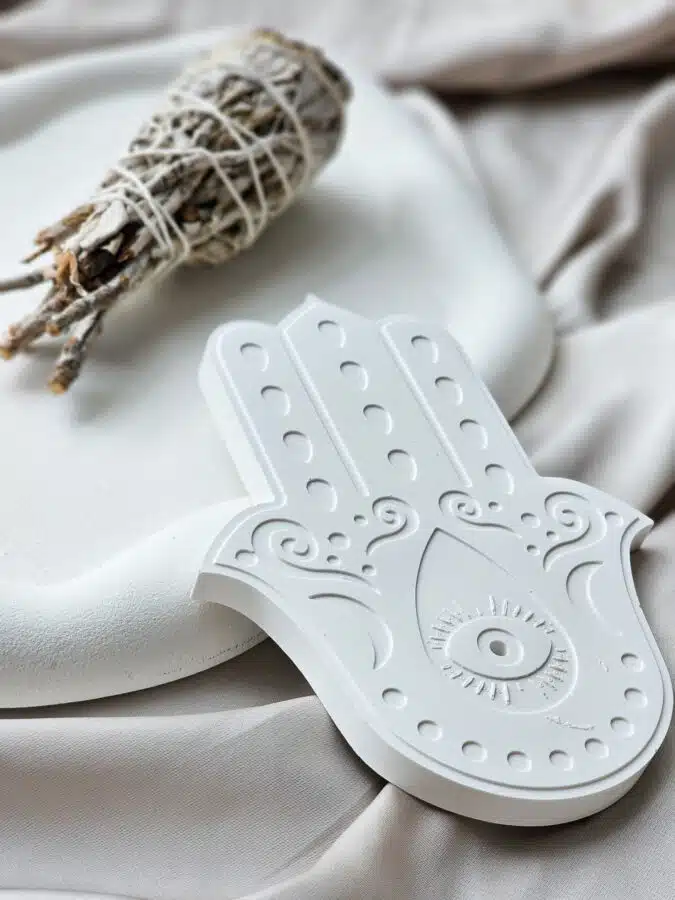 Podstawka pod Kadzidło Szczęście Hamsy to ręcznie wykonana, biała podstawka w kształcie Hamsy, ozdobiona symbolicznymi wytłoczeniami. Reprezentuje ochronę, szczęście i nowy początek. Idealna na kadzidło, świecę lub biżuterię, z dedykowaną dziurką na kadzidło. Każdy egzemplarz jest niepowtarzalny.