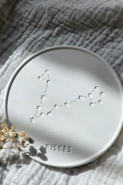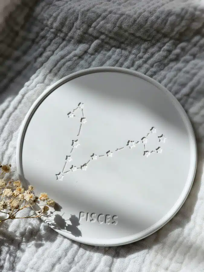 Podstawka pod świece z gwiazdozbiorem Ryb to ręcznie wykonana ozdoba z gipsu polimerowego, która sprzyja intuicji i duchowemu zrozumieniu. Z wytłoczoną konstelacją Ryb, doskonale nadaje się do przechowywania świec, kadzideł lub biżuterii, wzmacniając więź z duchowym światem.