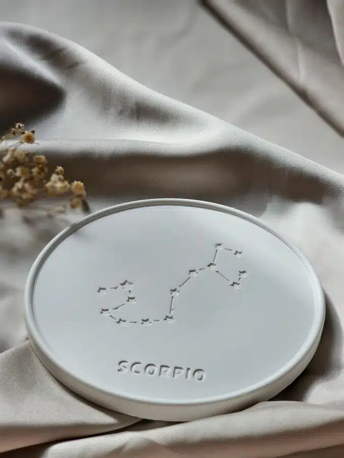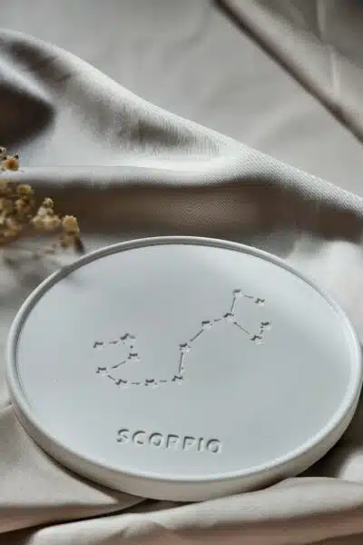 Konstelacja Skorpiona, wytłoczona na powierzchni podstawki, nadaje jej unikalny charakter, czyniąc ją nie tylko praktycznym, ale i duchowym elementem Twojego wnętrza. Idealna do przechowywania świec, kadzideł, biżuterii lub innych drobiazgów, ta podstawka wspiera procesy transformacji i duchowego rozwoju.