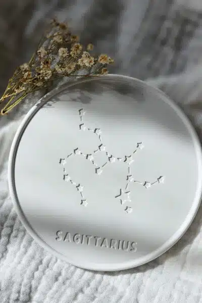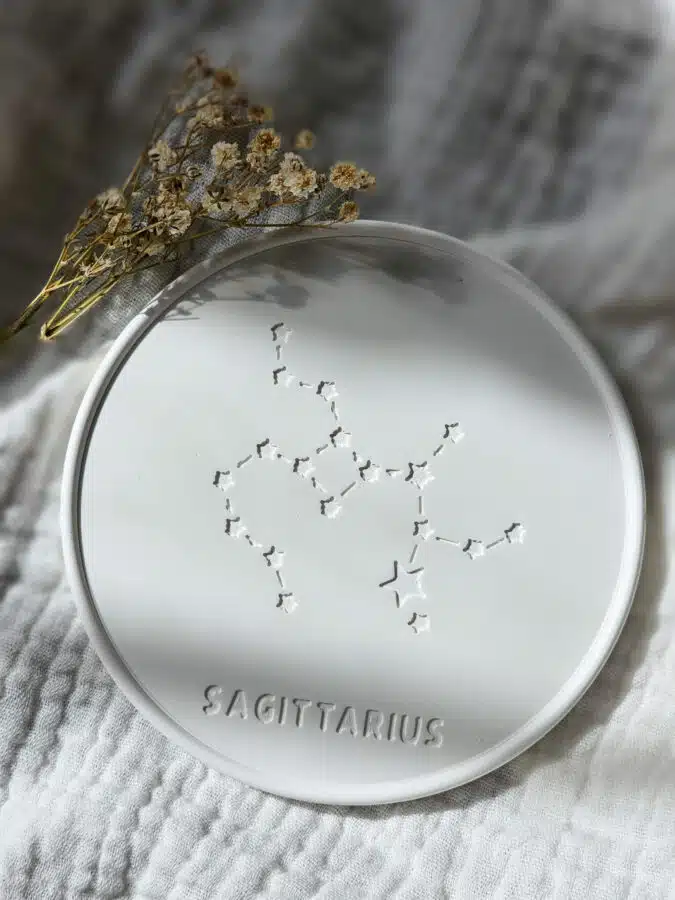 Podstawka pod świece z gwiazdozbiorem Strzelca, ręcznie wykonana z gipsu polimerowego, emanuje energią i optymizmem. Idealna do przechowywania świec, kadzideł lub biżuterii, z unikalnym wytłoczeniem konstelacji Strzelca, podkreśla wartość wolności i poszukiwania prawdy.
