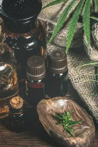 Różne butelki z olejkiem CBD i świeże liście konopi na drewnianym tle z jutowym workiem.