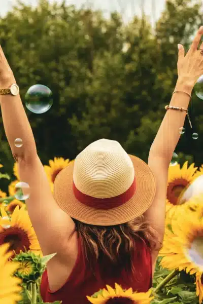 Kobieta w kapeluszu robi bąbelki mydlane na polu słoneczników.
